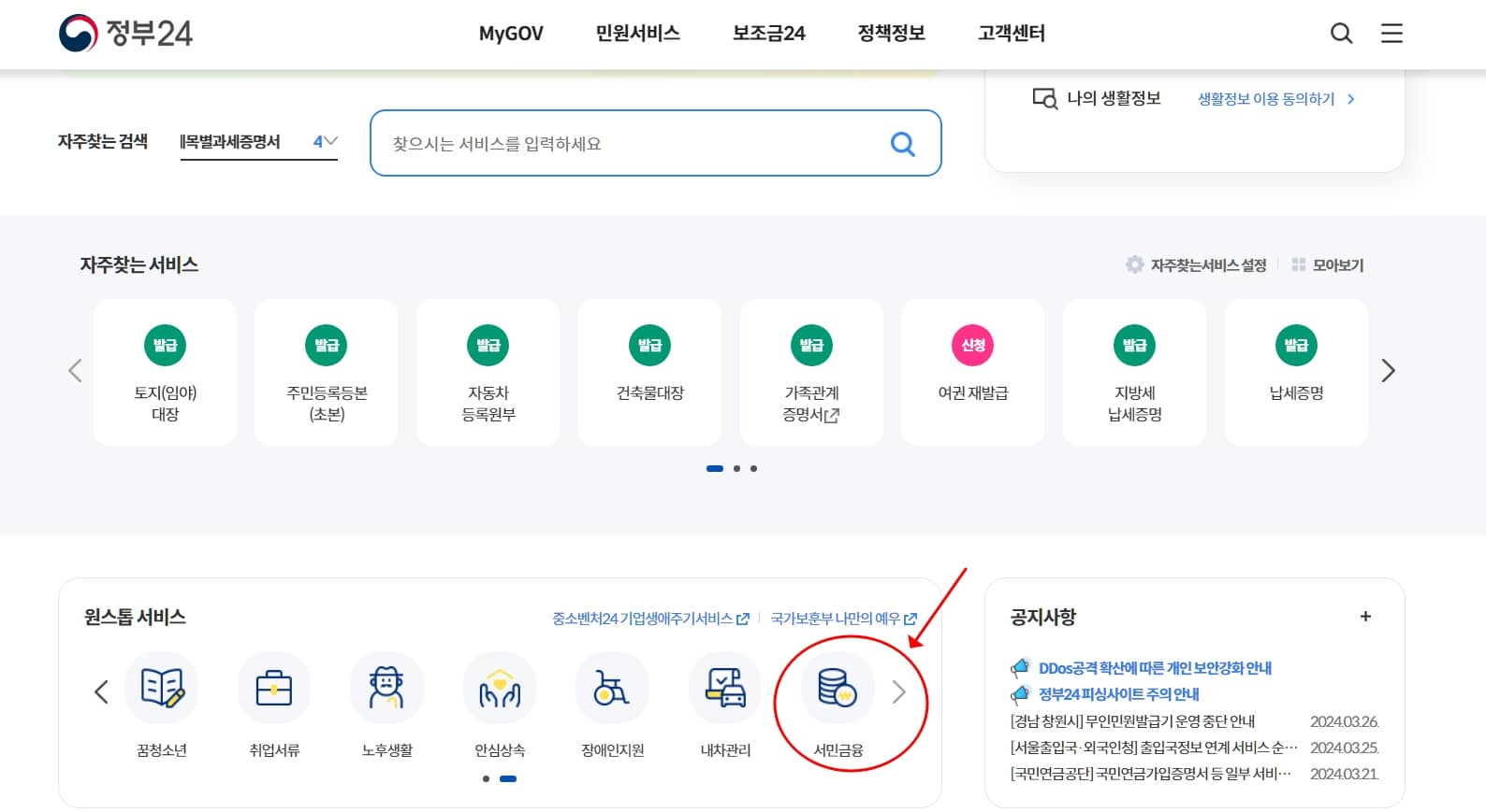 ① 정부24 홈 화면에서 원클릭 서비스 > 서민금융을 찾아서 클릭합니다.