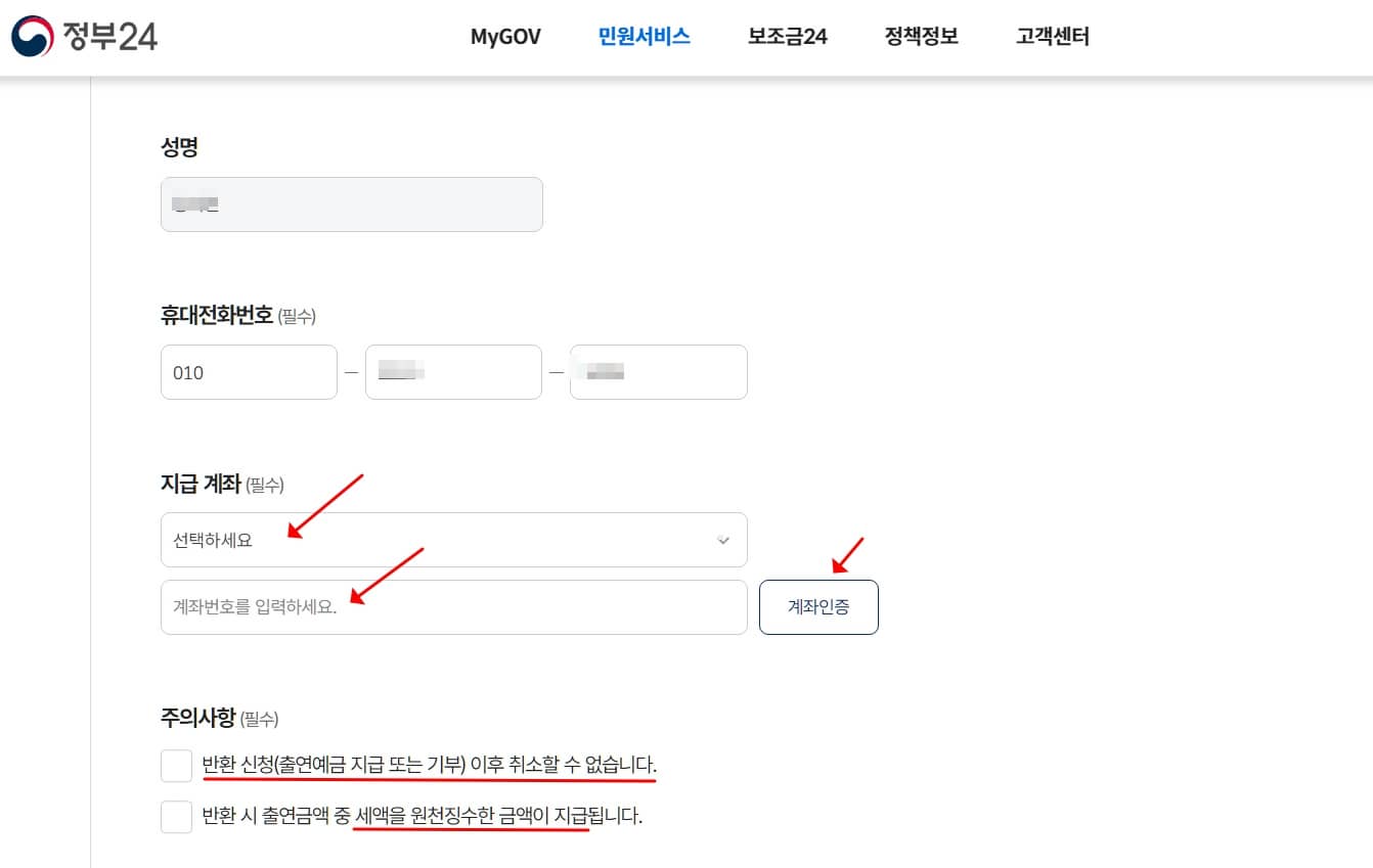 ⑥ 지급을 받을 계좌를 입력하고 계좌 인증을 받은 수 안내사항을 확인하고 신청하기를 누르면 됩니다.
