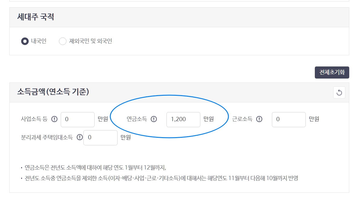 ③ 실제 계산하기에 앞서 다른 소득은 없고 연금만 월 100만 원이며 연간 1,200만 원, 그리고 자산은 공시지가 기준 7억 원 주택만 있다고 가정할 경우를 산정합니다.