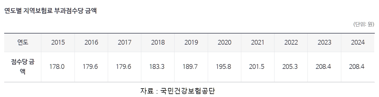 - 지역보험료(월): 보험료 부과점수 x 보험료 부과점수당 금액(208.4원)