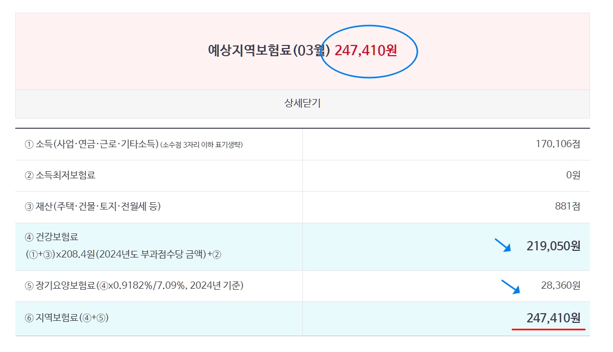 2024년 기준으로 전환하면 장기요양보험료 포함한 지역보험료가 월 247,4100원으로 추정됩니다. 작년에 대비하여 재산 부과기준의 기본 공제가 5,000만 원에서 1억 원으로 상향 조정되고 자동차 부과 기준이 제외되었으니 당연히 줄어들었을 것입니다.